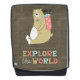 Oso Boho de estilo escandinavo completo con quiver, con texto multicolor "Explore the World" sobre el fondo rústico de color marrón burlap