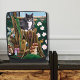 Gato de tom gris encaramado en una casa de hadas hecha de un tocón de árbol. Hadas tocando una flauta y un ratón afuera tejiendo en su silla rodean al gato.