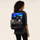 La obra original de ZoeSPEAK en esta mochila es una fotografía original de un gato durmiendo frente a un televisor. El gato es un calico, con patas blancas que se acercan a la cámara. Un programa sobre finanzas está en televisión, con un gráfico azul brillante que incluye las palabras "FINANCIACIÓN VENTURE CAPITAL". Debajo del gato, mostrando su interés en los asuntos financieros, están las palabras "CATIPALISTA DE VENTURA", en texto con un patrón de piel de gato y un resplandor azul detrás de él, como el resplandor azul detrás de la piel del gato en sus bordes.