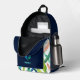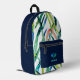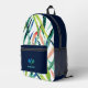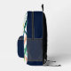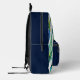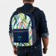 Acuarela Salta Mochila Impresa Monograma Moderno Un diseño personalizado sobre una acuarela abstracta verde, azul y roja deja fondo con un ilustracion de pickleball que puede ser reemplazado fácilmente subiendo su propio logo, imagen o motivo. El nombre de monograma personalizado en la tipografía moderna de bloques azules puede ser reemplazado por su propio nombre o texto personalizado. La parte delantera está en un color azul marino de moda. ¡El regalo o accesorio perfecto!