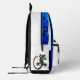 Art Gecko Esta mochila está decorada con una hermosa silueta de gecko multicolor en círculo y a los lados de la mochila. El fondo es un mosaico geométrico de un patrón azul purpurina, blanco y negro. El gracioso texto que dice "Art Gecko" es una referencia al "Art Deco", puedes personalizar como quieras.