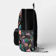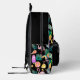 Un pájaro toscano, un flamingo rosado y una piña brillante se combinan con un cono de helado, helados, una rodaja de pomelo brillante y un limón, junto con estrellas doradas y hojas de palma verdes para formar un divertido patrón tropical en esta mochila. Las imágenes multicolores y brillantes se colocan sobre un fondo negro dramático. Luminoso, colorido y divertido, sin importar donde pases el verano.