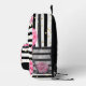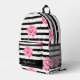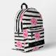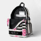 Esta bonita mochila de chicas presenta flores color agua rosa con rayas negras y un patrón de confeti dorado. Añade tu nombre al frente para personalizar.