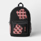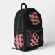Two-tone black and pink. Pink checkered appliqués on a black backpack. Add your name to the front and your text to the right and along the zipper. Alternatively, you can change the appliqué designs to your own images or pattern.