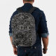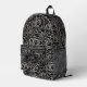 Modèle de sac à dos avec un motif de roses noires et blanches et une étiquette à personnaliser.