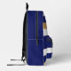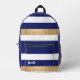 Mochila con rayas de bloques de color de diseño, de tonos azul, blanco y dorado. Personalice el nombre blanco para que se ajuste a sus necesidades. Ideal para la escuela, el trabajo, los viajes y más.