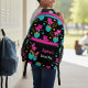 This hand-drawn backpack is covered with teal heart-shaped flowerpots and pink flowers with whimsical curly accents. They are laid out on a bold black background with playful orange swirls and dots. You can use it for school, gym, or overnight stays. The text is customizable.