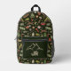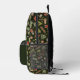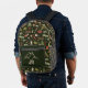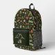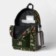 Camping y senderismo mochila verde caqui estampada con elementos de garabatos de campamento en tonos de verde y marrón. El área del bolsillo frontal tiene un diseño de rango montañoso rústico sobre el texto de monograma personalizable