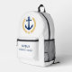 Un personalizado diseñó ancla náutica, hojas de laurel de estilo dorado y una estrella dorada con rango de capitán u otro título y Su nombre personalizado o nombre de barco en azul marino regal sobre una mochila blanca uniforme. Hace un gran regalo.