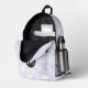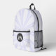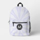 Mochila útil con ramas blancas radiantes por todas partes. Como una explosión de sol blanca gigante. Se parece a un tipo de mordida, pero no lo es. Incluye círculo negro en un patrón fractal. En el círculo reside una inicial blanca. Usted puede cambiar, o personalizar, el monograma por su cuenta, o la persona que desea darle la mochila. Regalo divertido para cualquier ocasión. Genial para volver a la escuela.