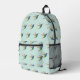 Mochila fina con un patrón de ave de zafiro de cola dorada sobre un fondo azul claro.