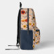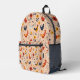This fun backpack design features a colorful chicken art pattern with a pastel orange background and blue side and bottom patches. A fun chicken lover design for a gift to be used for back to school, diaper bag, picnics, the beach, travel and more.