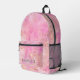 Esta mochila de moda presenta un patrón de cuarzo de rosa de fuego rosa. Añade tu nombre para personalizar.