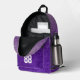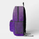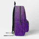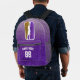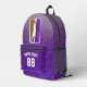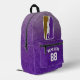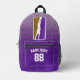 Show your love for the game with this customizable basketball backpack featuring bold purple and gold tones against a faux glitter background. The design centers around a dynamic silhouette of a basketball player going in for a layup, housed in a stylized cartouche shape on the main panel of the school bag. Add your name and jersey number for a personalized touch that’s perfect for players, fans, and coaches alike. Whether for game day, team banquets, or fan gear with flair, this backpack is a slam dunk for basketball lovers.