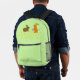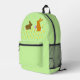 Esta impresionante mochila tiene un par de lindos conejitos de Pascua rodeados de flores de daffodil amarillas. Los conejos son marrones con orejas grandes, ojos negros y colas blanquecinas. Uno de los conejillos sostiene un huevo de Pascua con un arco violeta de bonito y se acerca para ofrecerlo al otro conejito. Los folletos son amarillos y tienen un centro naranja luminoso.