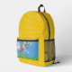 Cuidada jirafa personalizado con una margarita en la boca parada en un césped alto con flores blancas. El fondo son puntos de polka blancos sobre un fondo de efecto edredón amarillo. Los puntos de corte se representan digitalmente.