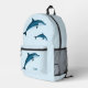 Mochila azul claro, dulce, suave y neutra de género con tres delfines lúdicos azules. El texto se puede personalizar o eliminar. Perfecto para los amantes de los delfines en la escuela o en las actividades deportivas.