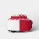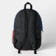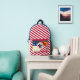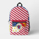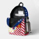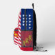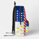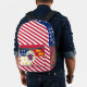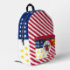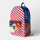 All-ove print backpack with flag of city of Detroit, Michigan; red, white and blue flag with stars and stripes, fleur-de-lys on white, yellow dragons on red, and the seal of the city