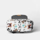 Cute Dogs scattered on a white background with the word "woof" dotted about in between pattern with a grey pocket featuring a cute big eyed puppy backpack.