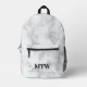 Esta mochila tiene un elegante patrón falso de mármol blanco. Hay tres letras negras en el bolsillo. Puede cambiar las iniciales para mostrar el monograma correcto.