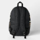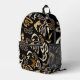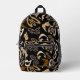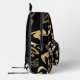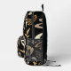 Mochila en color negro y estampado de fantasía con elementos botánicos y formas abstractas, donde los elfos y sus máscaras se mezclan entre el aleteo de las mariposas.