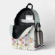 Experimente la alegría de la primavera con esta artística mochila floral. La bolsa tiene una vibrante impresión de flores florecientes inspirada en la naturaleza en tonos amarillos, púrpura, naranja y rosa con una línea negra oscura, todo ello contra un tranquilo paisaje de fondo azul cielo que se desvanece en blanco en la parte inferior. La primera es totalmente personalizable. La manecilla negra de la parte superior y las correas de hombro proporcionan un contraste sorprendente al diseño colorido.