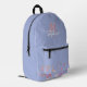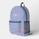 Esta bonita mochila está decorada con un campo de flores, en tonos naranjas y rosas, sobre un fondo azul claro. En la parte superior, tu nombre y tu inicial están sutilmente entrelazados en un círculo semiabierto. Es moderno y elegante, perfecto para cualquier ocasión.