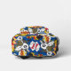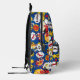 La mochila presenta un diseño atrevido y vibrante inspirado en un libro de historietas. El fondo es de un color azul brillante, y está cubierto por varios efectos de sonido de historietas y símbolos, como "¡BAM!", "¡POW!", "¡SNAP!" y "¡BOOM!". El diseño también incluye tornillos relámpago, estrellas y otros elementos gráficos. El efecto general es llamativo y dinámico.