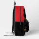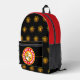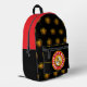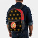 Mochila roja y negra con diseño de círculos concéntricos rojos, blancos y dorados con "KANSAS CITY, MISSOURI CENTER OF THE UNIVERSE GO GHIEFS!!" "¡¡HEY BABY!! SUNNY & RAYRAY BEAM THE SUNSHINE BROTHERS" con una foto de Sunny and RAYRAY BEAM y con logos Y-NOT-ME en el fondo. Este diseño es un grito a Kansas City, sede de Misuri del Superbowl Champions.