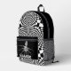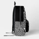 Patrón geométrico en blanco y negro de cuadrados y rectángulos con pulpo de calamar monstruo e inscripción "KRAKEN".