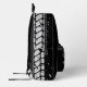 Prepárate para el nuevo año escolar con este Camino Atrás con letras grises y mochila de fondo negra. El lema "La vida empieza en las carreteras traseras", con letras grises y huellas de neumáticos turbios.