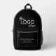 Mochila negra profesional moderna para su negocio con su logotipo. Añade tu nombre comercial, eslogan, sitio web, sociedad u otro texto en una tipografía simple y blanca en el bolsillo delantero.