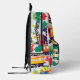 Trenes cortos en vías con grandes árboles sobre fondo azul.