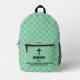 Mochila cristiana de patrón geométrico de menta, con una cruz. Se puede personalizar el texto, incluyendo sus propias iniciales (o su nombre si lo prefiere), su libro favorito de la Biblia, el capítulo y verso, y se puede incluir una pequeña cita del verso - o simplemente borrar la cita si se quiere mantener el diseño como un simple estilo de libro-capítulo-verso.
