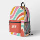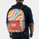 Carry your gear in bold, vibrant style with this unique personalized everyday backpack. Featuring a striking, colorful pattern of retro wavy stripes in shades of pink, coral, yellow, and turquoise, this bag is both practical and fashionable. The design includes a solid red front pocket with your chosen monogram initials or name (the 'AMW' shown is a placeholder). It's the ideal bag for students, commuters, or travelers—perfect for holding books, laptops, or daily essentials while showcasing your unique flair.