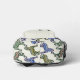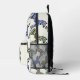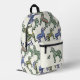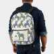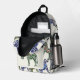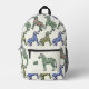 Su monograma junto a una cebra rayada verde en el bolsillo delantero. El resto de la mochila es un patrón de cebras rayadas de color azul, rojo ladrillo, verde y mostaza.
