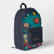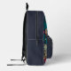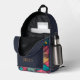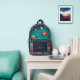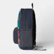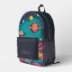 Mochila impresa de un monograma moderno galáctico con planetas espaciales Un diseño personalizado sobre un fondo de planetas espaciales que le da un aire moderno y fresco. El nombre de monograma personalizado en la tipografía de bloques moderna y naranja puede ser reemplazado por su propio nombre o texto personalizado. El bolsillo delantero es un minimalista espacio limpio azul. ¡El regalo o accesorio perfecto!