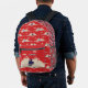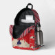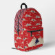 Cree una mochila personalizada para su moto de nieve favorita cuando añada su nombre a esta bolsa. Presenta un patrón de motos de nieve, montañas nevadas y nubes onduladas en tonos azules, marfil o crema colocadas sobre un fondo rojo.