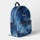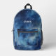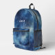 Noche galáctica azul Monograma moderno Mochila impresa Una misteriosa mochila galáctica nocturna con una línea de texto El nombre de monograma personalizado de la parte superior en letras blancas de bloque puede ser reemplazado por su propio nombre o texto personalizado. El regalo o accesorio perfecto.