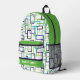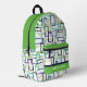 La mochila de nombre personalizado de patrón geométrico abstracto moderno presenta un diseño geométrico moderno en verde y púrpura sobre un fondo blanco con su nombre, monograma o texto personalizado. Perfecto para la escuela, deportes, gimnasia, viajes y más. Diseñado por ©Evco Studio www.zazzle.com/store/evcostudio