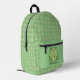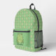 Mochila adorable con un lindo patrón de muchas ranas verdes y hojas verdes sobre un fondo verde. En el bolsillo delantero hay una rana verde más grande sobre un fondo verde liso con una plantilla para añadir tu nombre u otro texto a personalizar.
