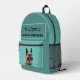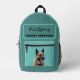 Esta mochila de color verde azulado tiene una foto de cerca de la cabeza de un perro pastor/alsaciano alemán en el bolsillo de atrás. La mochila está en dos tonos verde azulados, oscuros y claros. Puede personalizarlo con su elección de nombre y palabras, y también hay una opción para reemplazar la foto por una propia.