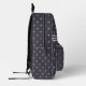 Esta mochila presenta un nombre escrito de ciruela polvorienta en una banda de estilo gris rosa pálido sobre la bolsa sobre un patrón de diamante en la púrpura polvorienta de ciruela con flores de diamante en las intersecciones.