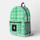 Patrón de platillos Gingham Check Mochila de Monograma Verde y Blanco claro . Todo ello en un estilo de tartán luminoso con un patrón de verificación de gingham blanco y verde claro. Ideal para viajeros, mochileros, excursionistas, campistas, fanáticos de la aptitud, estudiantes, profesores y amantes de los estampados a cuadros en colores hermosos. Añade tu monograma inicial para un toque personalizado!