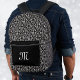 Esta mochila tiene un elegante patrón de damasco hecho en blanco y negro. Tiene rollos blancos y elegantes sobre negro. El bolsillo delantero es negro, donde se puede personalizar el texto inicial o el texto con la plantilla.