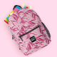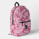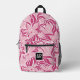 Diseño fresco de mochila que presenta un patrón floral colorido en rosa caliente de moda y rosa más claro coordinado con acentos blancos. Las flores se repiten en la parte delantera, superior y laterales. Un acento de plantilla elegante en la bolsa frontal en negro y blanco permite personalizar con una o dos iniciales. Contáctame por mensaje de Zazzle con preguntas o solicitudes de color personalizado.