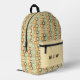 Esta mochila tiene un color azul verde azulado, marrón chocolate y naranja. Un patrón simple de rectángulos y líneas que tiene un aspecto groovy de los años setenta. Este patrón tiene un fondo de color crema con un diseño geométrico en azul verde azulado o azul acuático, naranja y marrón chocolate. Los gráficos geométricos tienen un aspecto estrafalario y angustioso que le da un aspecto vintage desgastado. Los colores de inspiración vintage le dan un toque de los años 70. El bolsillo delantero está listo para ser personalizado con sus iniciales con letras marrones oscuras contra un fondo de color crema.