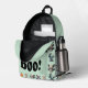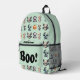 Esta divertida mochila Halloween para niños presenta un diseño lúdico con un fondo verde azulado claro y encantadores monstruos de Halloween al estilo de crochet acuático, cada uno con una apariencia única y entrañable, que le añade un toque de astucia y diversión. "¡Boo!" está en el bolsillo delantero con un nombre editable justo encima.