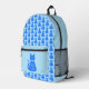 Esta impresionante mochila presenta una imagen de arte digital de un lindo gato azul con una cola rizada. Sus ojos son azul pálido con pupilas negras. Lleva un arco rosado en el cabello y un lustrante cuello azul con una ficha azul en el cuello. El diseño es perfecto para celebrar a un niño. Hay texto personalizado en el gato para que puedas incluir tu propio mensaje. El mensaje predeterminado es Baby Boy.
