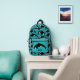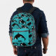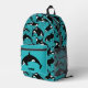Añada un toque acuático a cualquier día con esta mochila ilustrada que muestra ilustraciones de orcas o ballenas asesinas en blanco y negro contra un fondo de olas azul océano verde azulado. Este bolso está listo para ser personalizado con sus iniciales en el bolsillo delantero con letras negras en negrita.